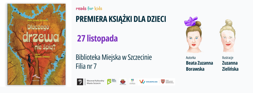 Zapraszamy na premierę książki dla dzieci pt. „Dlaczego drzewa nie śpią” (wyd. Reads for Kids) autorstwa Beaty Zuzanny Borawskiej, z ilustracjami Zuzanny Zielińskiej.